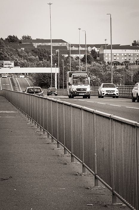 An ambulance on an emergency call rushing through Redheugh Bridge between Gateshead and Newcastle.