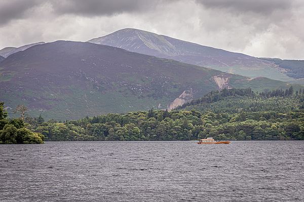 A tourist boat on a lake, with a forest and hills on the background