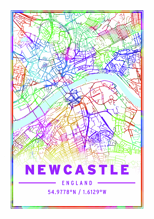 A colorful representation of a map outlines the city layout of Newcastle in England, complete with rainbow hues marking different areas and streets. Below the vibrant map is text that reads "NEWCASTLE" with "ENGLAND" beneath it, and further below are the latitude and longitude coordinates of the city.