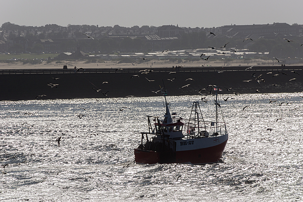 A fishing boat safely returning back to harbour in Tynemouth, North Shields, North East England.
